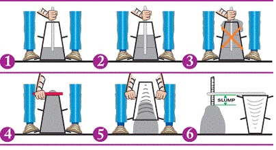 4-5: Όταν συμπυκνώσουμε και την τρίτη στρώση επιπεδώνουμε την τελική επιφάνεια ελαφρά με μυστρί και καθαρίζουμε το σκυρόδεμα που έχει πέσει έξω από τη μήτρα στη βάση του κώνου, και βάζουμε τα χέρια μας στα δύο χερούλια της μήτρας, μετακινούμε τα πόδια μας από τα μεταλλικά «αυτιά» της βάσης του κώνου και ανασηκώνουμε κατακόρυφα τον κώνο προς τα επάνω με σταθερή ταχύτητα, μέσα σε 5-10 sec.