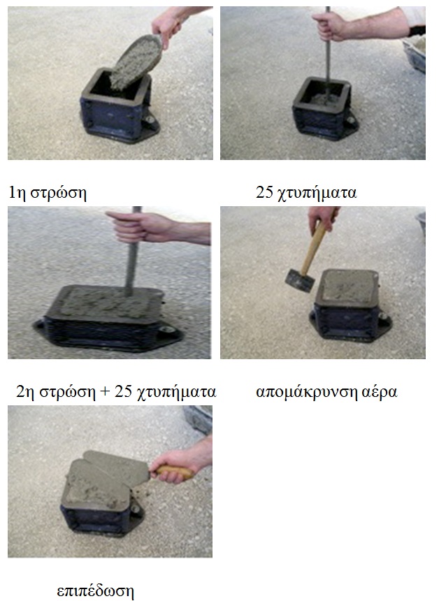 - Με ράβδο συμπυκνώσεως αν η κάθιση θα είναι μεγαλύτερη από 50mm. Το σκυρόδεμα θα διαστρώνεται μέσα στη μήτρα σε δύο στρώσεις ίσου ύψους. Ο αριθμός χτύπων ανά στρώση θα είναι 25 και η ράβδος θα εισχωρεί κατά 20 mm στην κατώτερη στρώση.